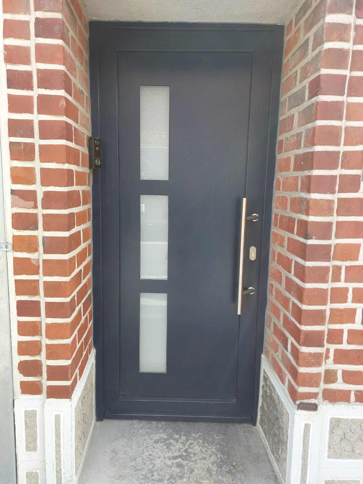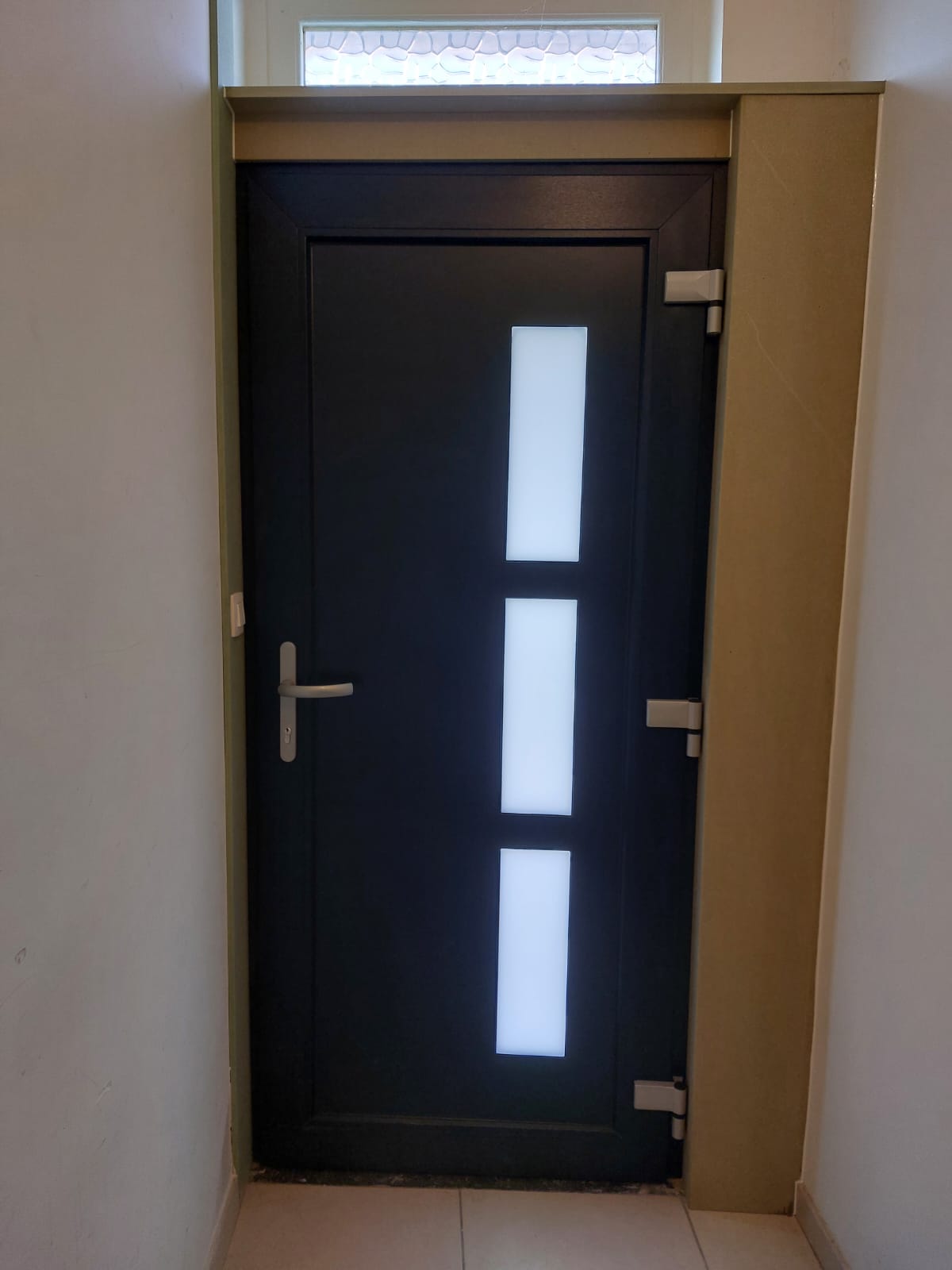 De houten voordeur was duidelijk aan vervanging toe. Er werd gekozen voor een onderhoudsvriendelijke PVC-deur met lichtinval. Ook de binnenzijde werd uiteraard netjes afgewerkt.
