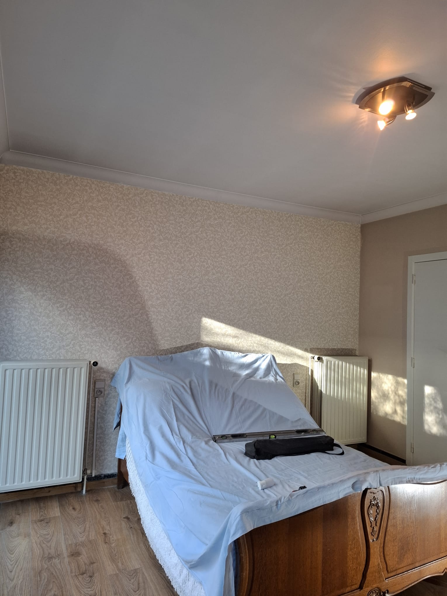 In de woning van een oudere dame was er helaas ernstige waterschade ontstaan. De verzekering schakelde Plan D'Artagnan in om alles weer netjes te herstellen. We demonteerden de radiatoren, verwijderden het beschadigde behang, plamuurden de muren, brachten nieuw behang aan en plaatsten de radiatoren opnieuw.