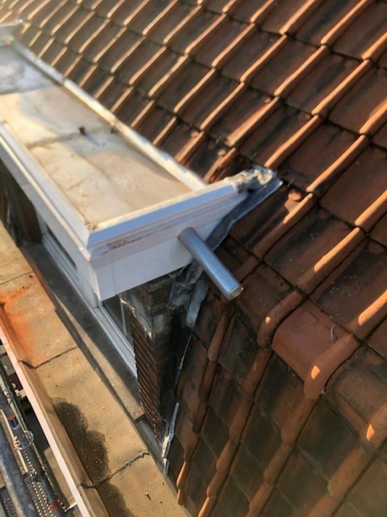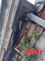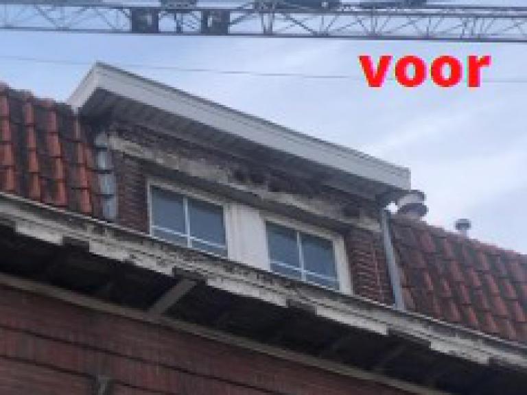 Een kapotte bakgoot leidde niet alleen tot rot houtwerk maar was ook de oorzaak dat de façadestenen en de dakgootbekleding loskwamen. Nefast voor het huis en gevaarlijk voor passanten. Plan D'Artagnan zorgde voor een nieuwe bakgoot, regenpijp en dakgootbekleding. Na het plaatsen van nieuwe pannenlatten werden de kapotte pannen vervangen. Ook de loszittende stenen werden verwijderd, opgekuist en teruggeplaatst.