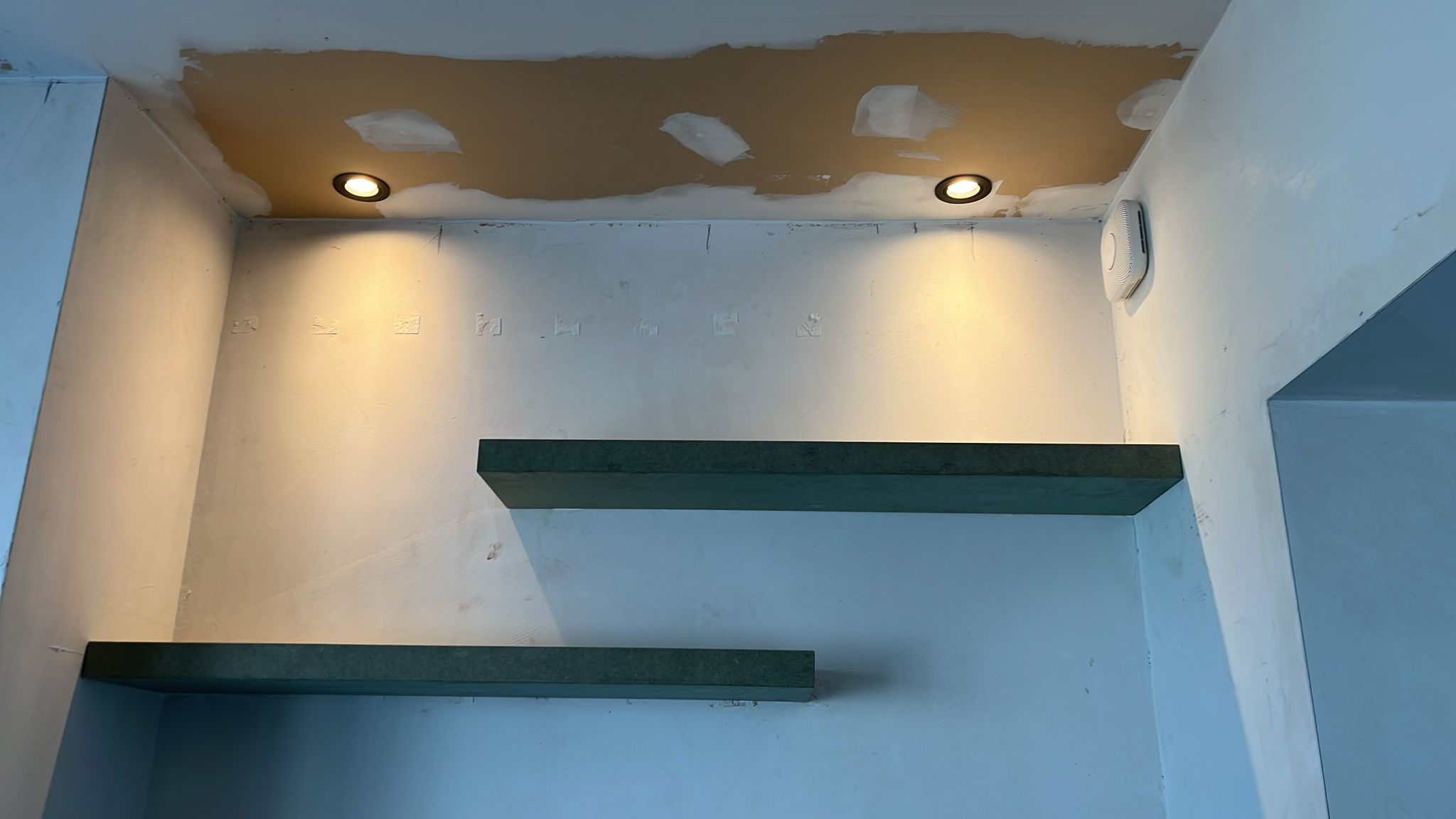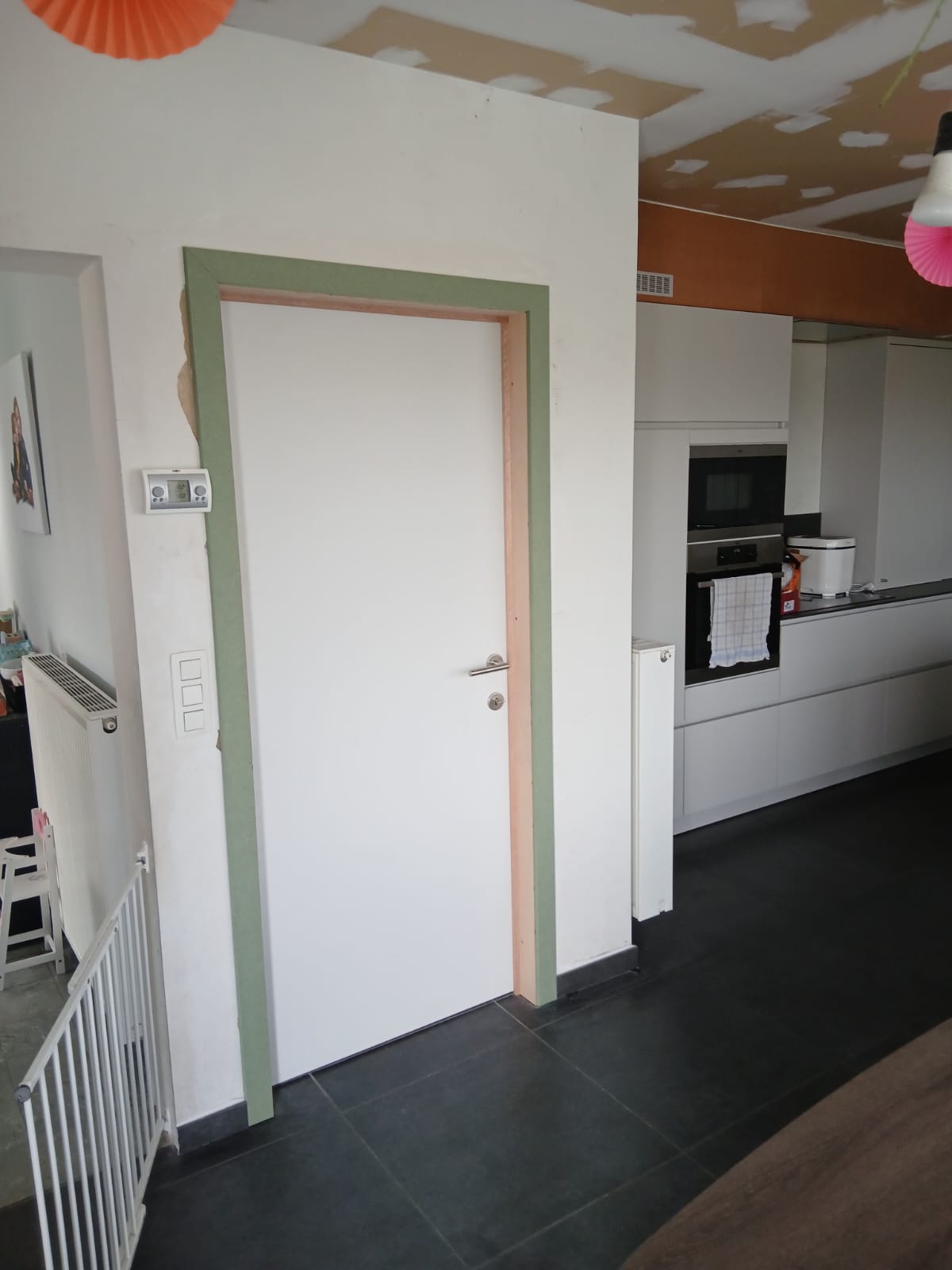 We werden ingeschakeld om drie tubespaan binnendeuren te plaatsen. Ook werd er gevraagd om 2 legborden met onzichtbare bevestiging op maat te maken en te plaatsen. Onze elektricien zorgde tevens voor de verlichting.