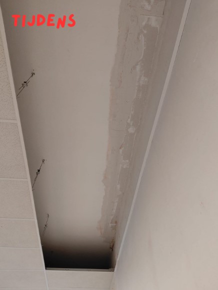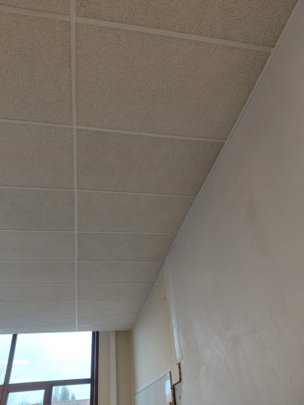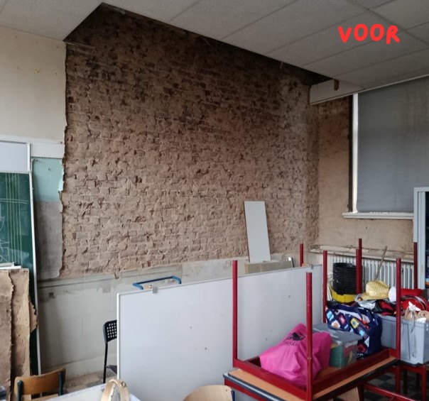In deze lagere school was een volledig stuk van het pleisterwerk – en daardoor een deel van het plafond – naar beneden gekomen. Geen prettig zicht, zeker niet in een schoolomgeving. Wij herstelden alles in geen tijd en zorgden ervoor dat het plafond er weer veilig en verzorgd uitziet.