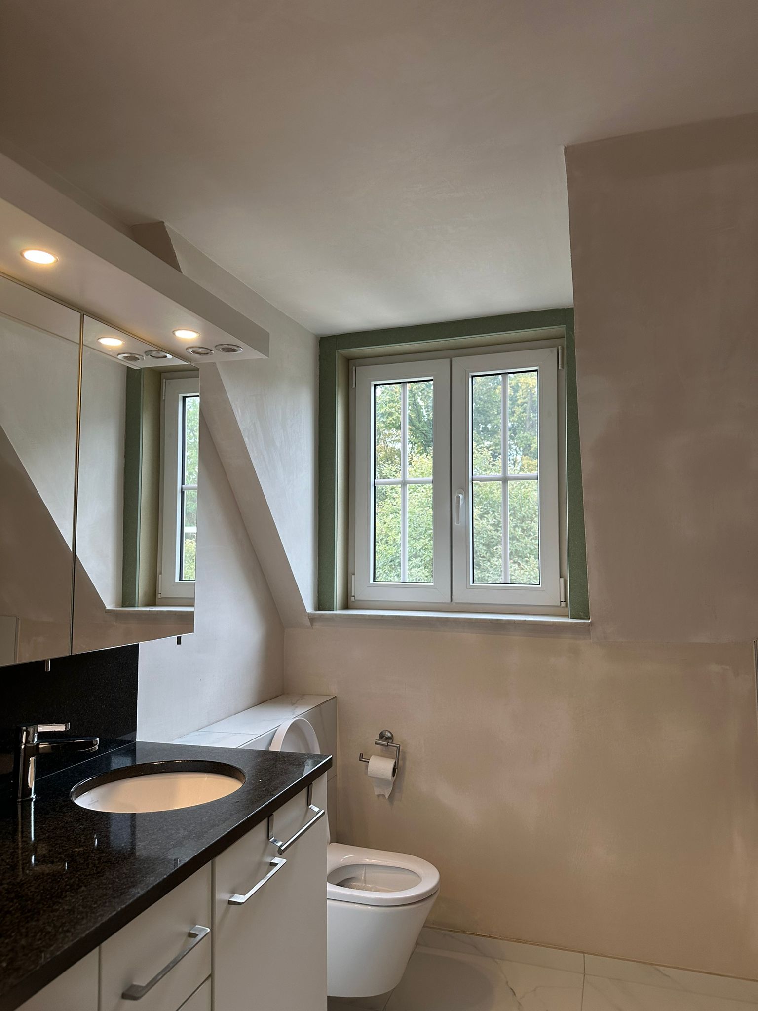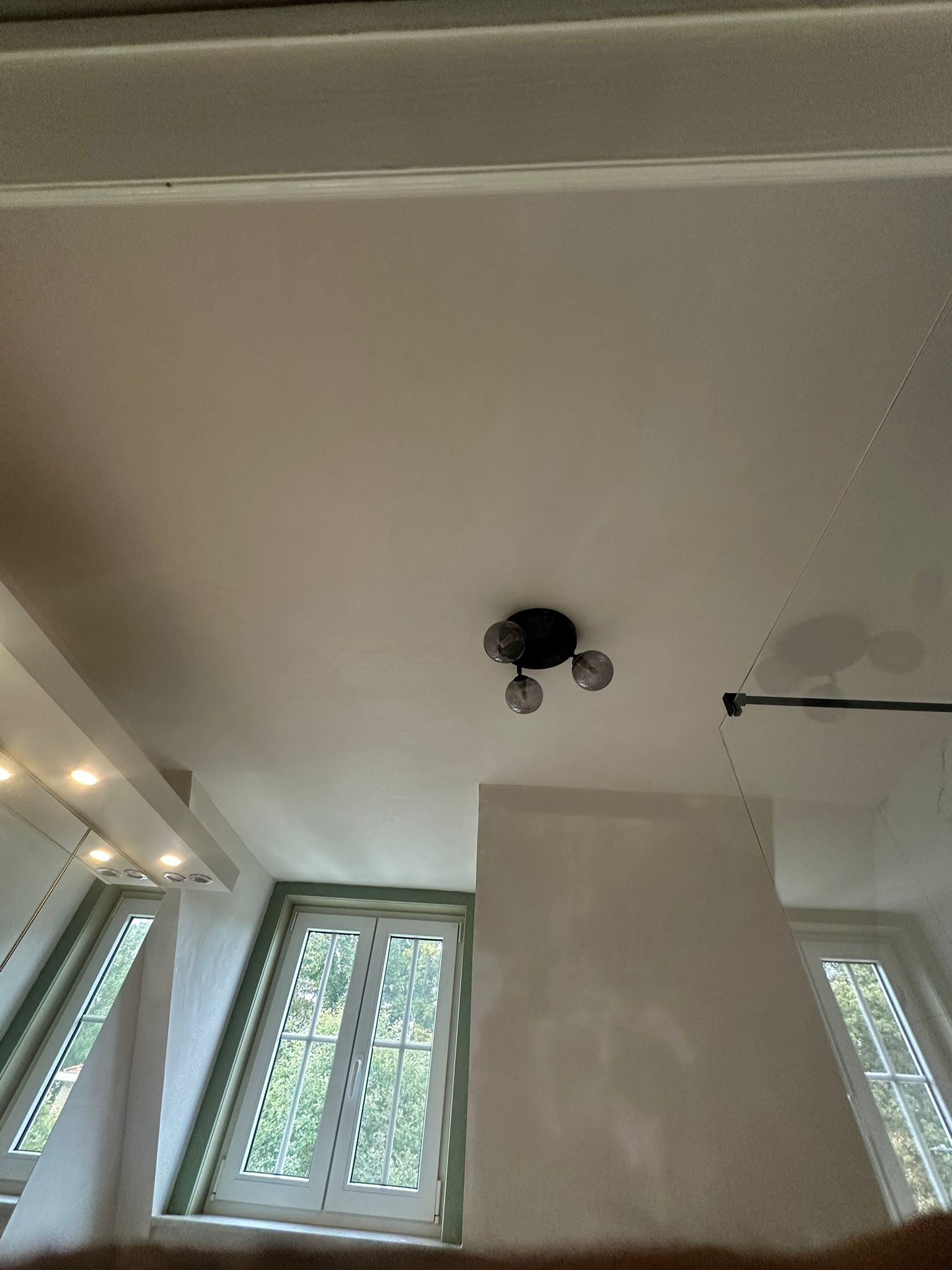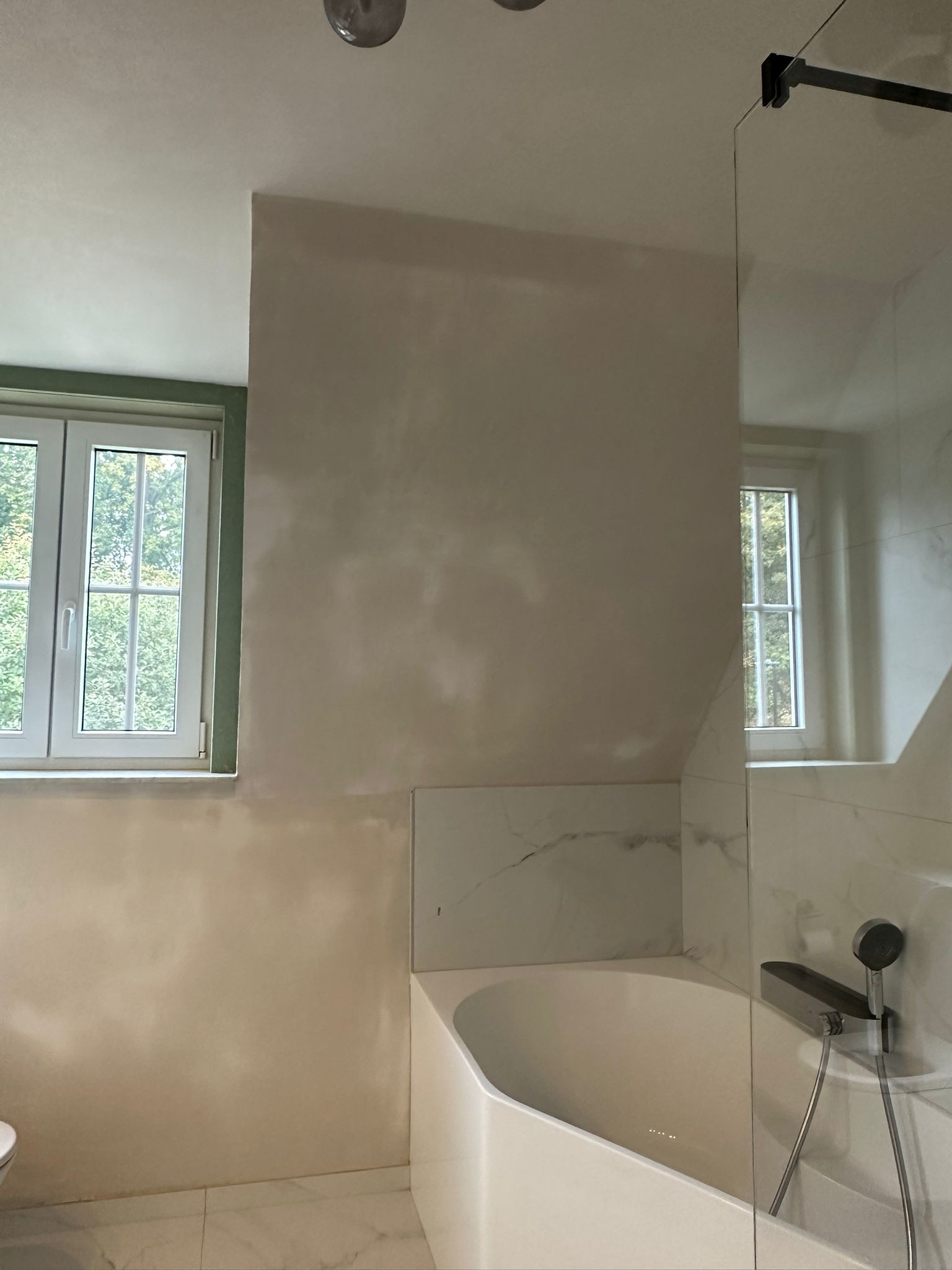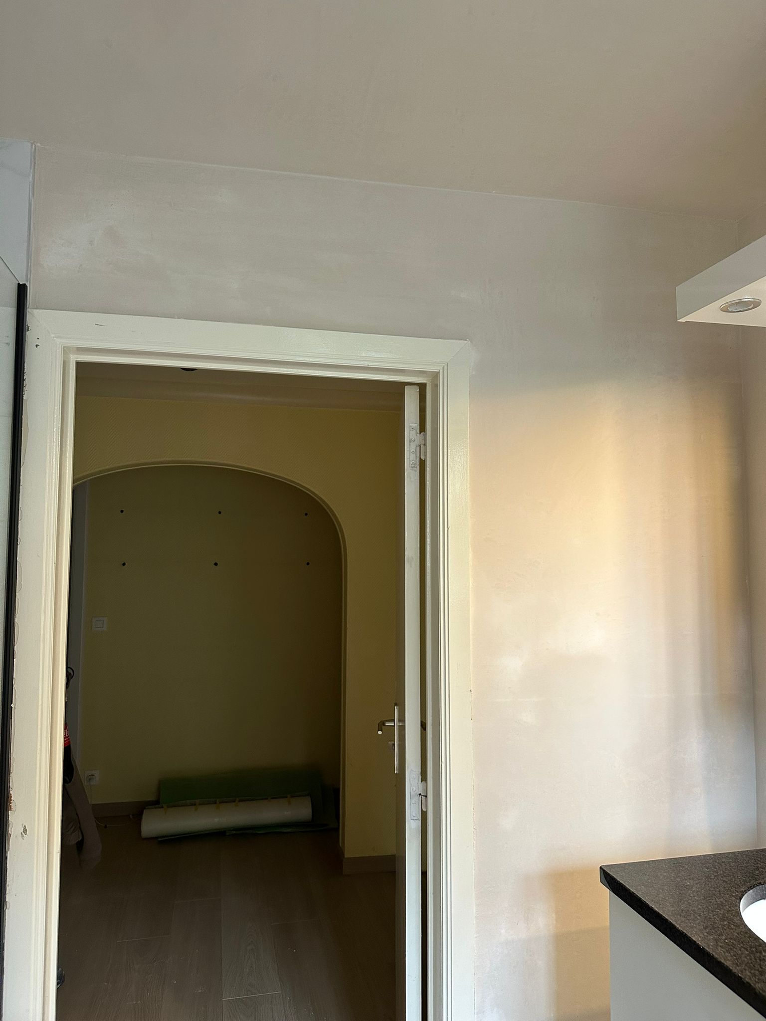 Plan D'Artagnan werd ingeschakeld om de muren met glasvezelbehang en heel wat beschadigingen weer mooi strak te zetten. Dankzij zorgvuldig plamuurwerk is alles opnieuw klaar voor een frisse afwerking. Super resultaat
