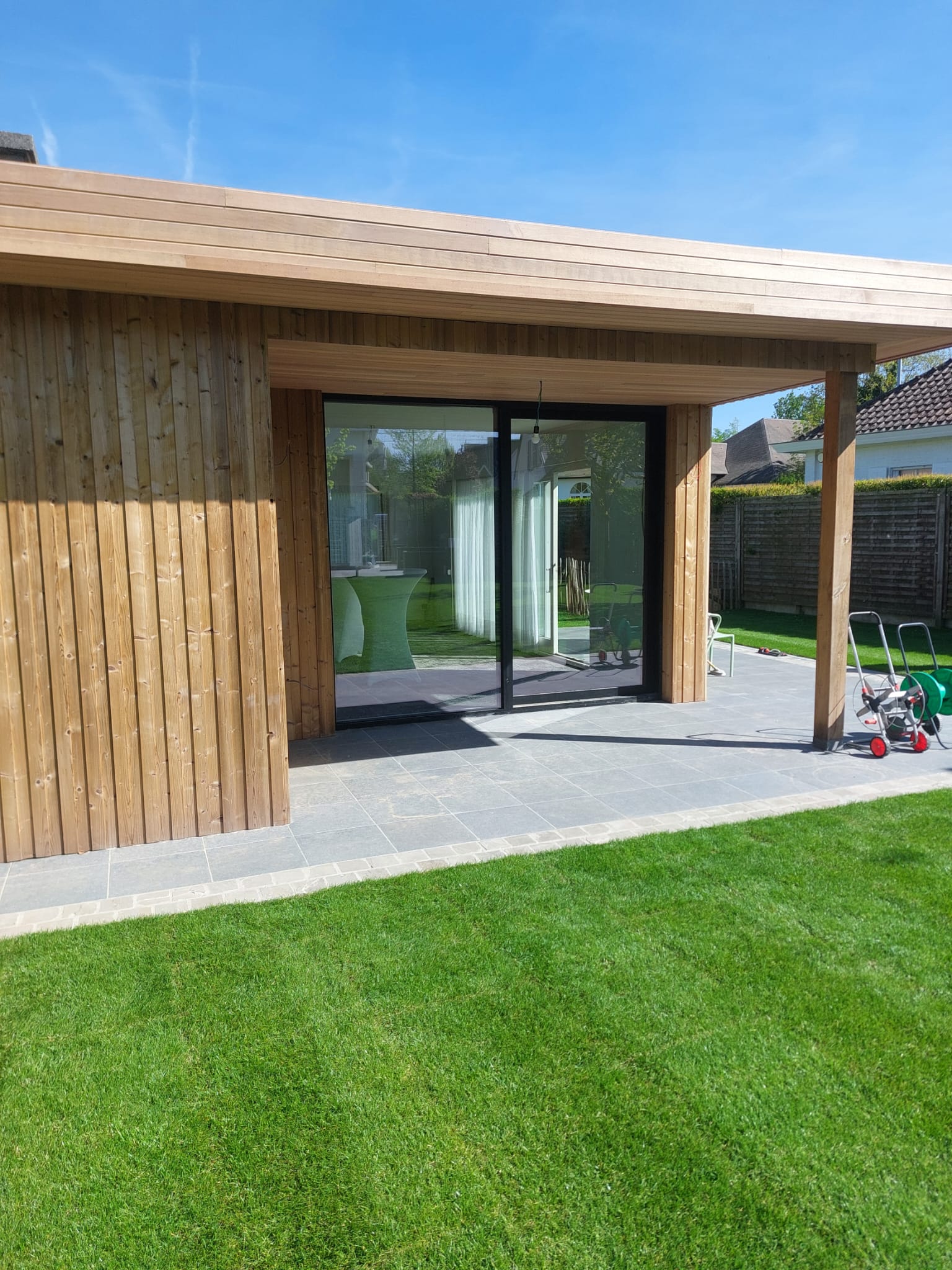 We plaatsten een hefschuifraam en installeerden een gevelbekleding in thermowood, wat zorgt voor een duurzame en esthetische afwerking van de aanbouw.