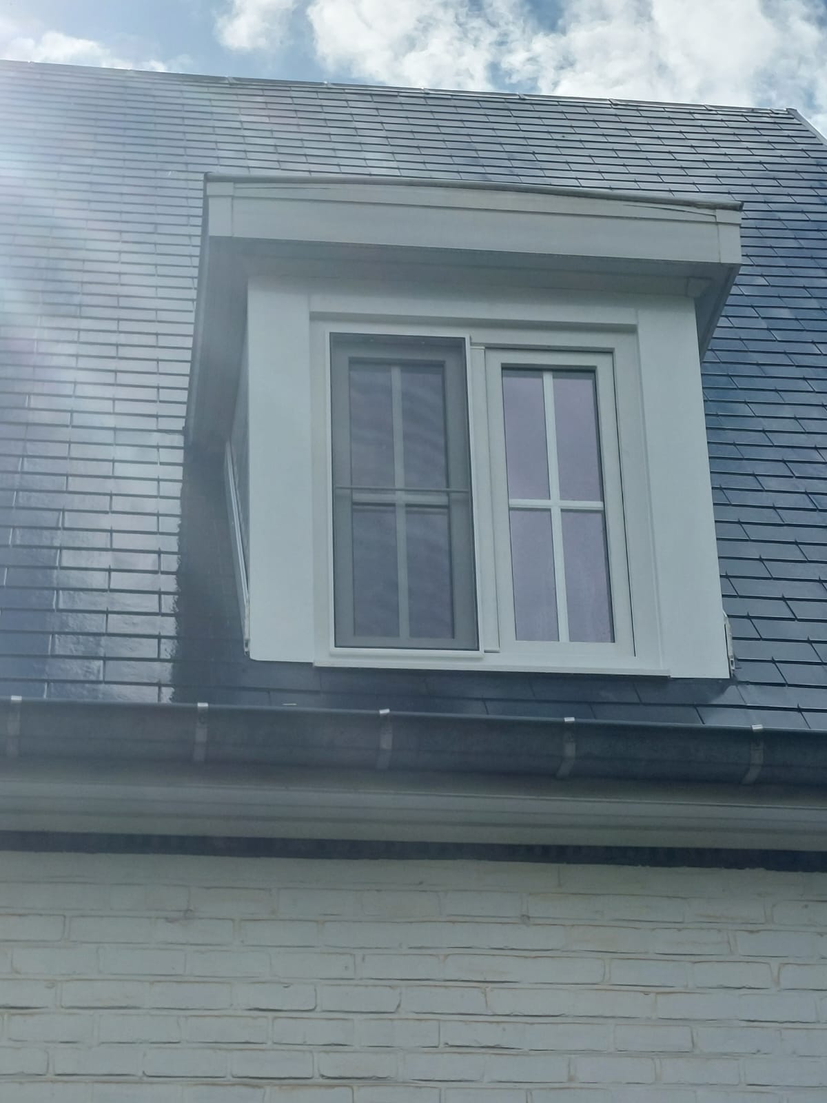 Buitenschrijnwerk is helemaal ons ding! In deze dakkapel vervingen we het oude houten raam door een nieuw raam in PVC. We zorgden voor een strakke buitenafwerking met op maat gemaakt aluminium. Binnen kreeg alles een nette afwerking en we plaatsten ook een insectenhor, zodat de klant zorgeloos kan ventileren.