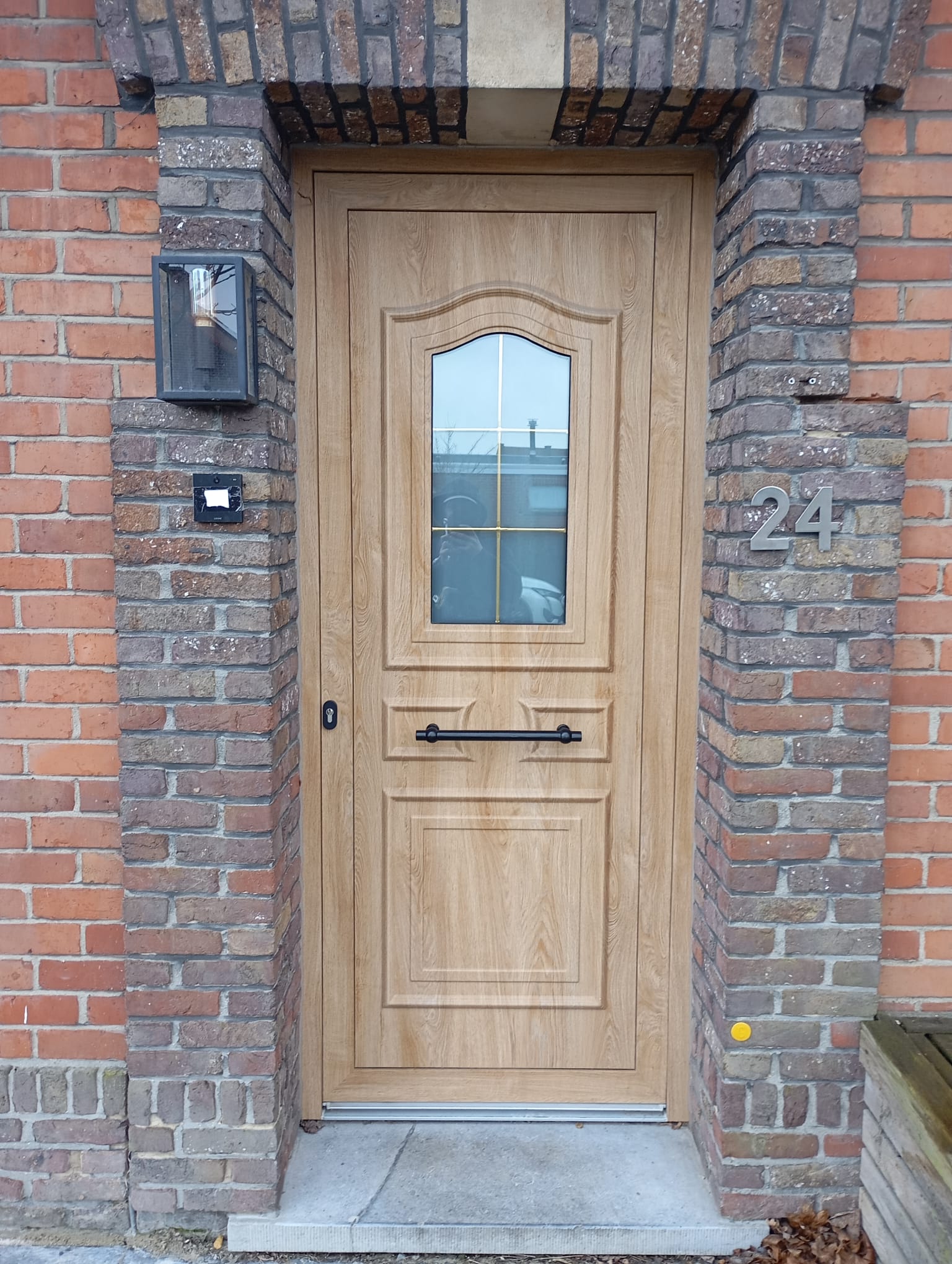 De eyecatcher van het project? Dat is zonder twijfel de voordeur: een landelijke PVC deur met houtnerfstructuur en matte beglazing, afgewerkt met een elegante kruisverdeling in koper. Een uniek accent dat perfect past bij de stijl van de woning.