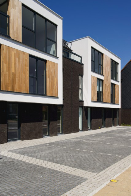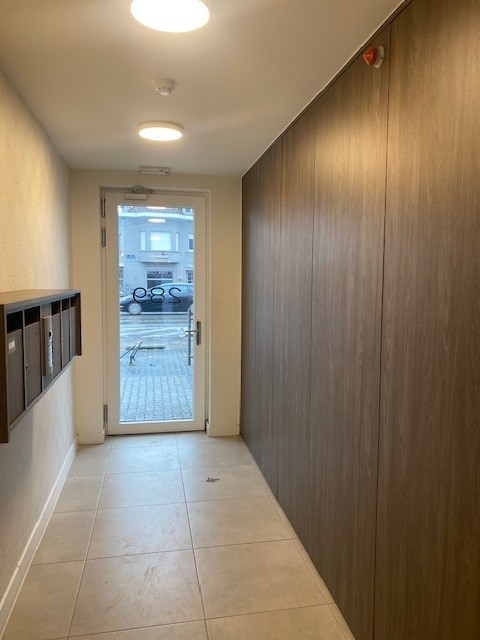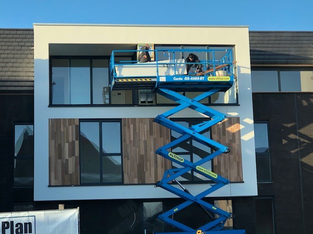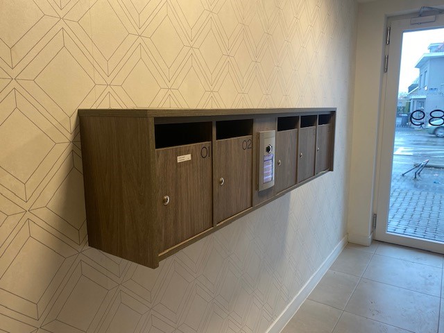 Daarnaast zorgden we voor het maatwerk in de inkomhallen : van brievenbussen tot maatkasten voor alle technieken. Ons team bracht ook de houten gevelbekleding aan en plaatste de glazen balustrades.